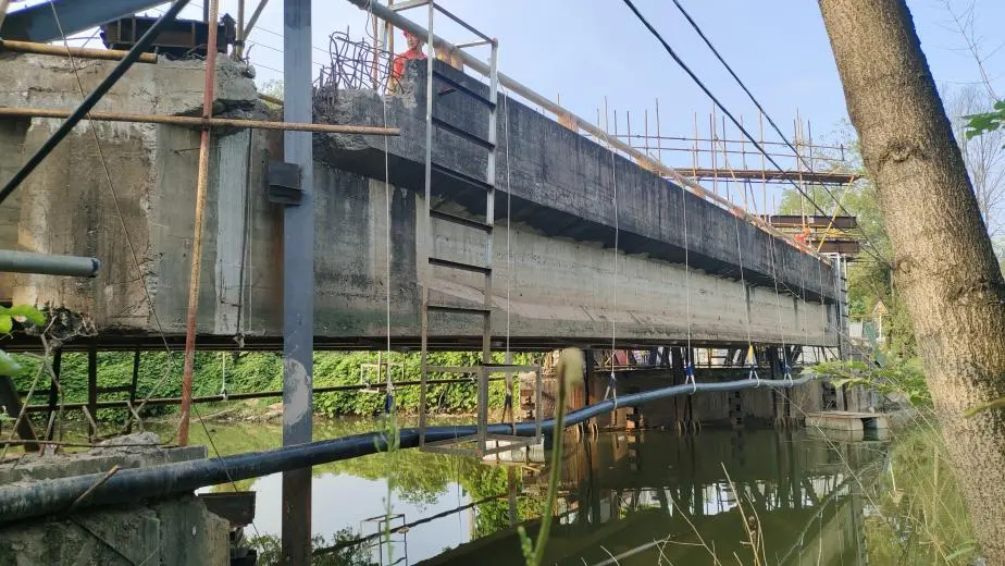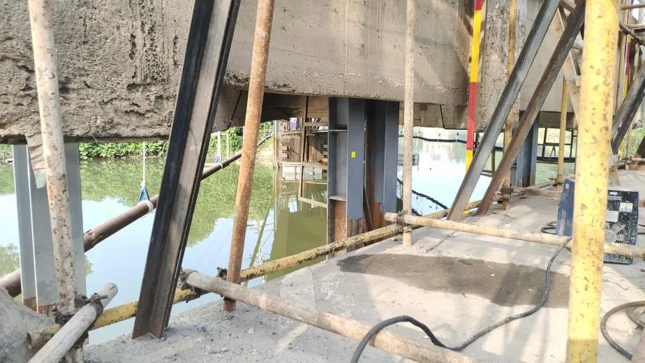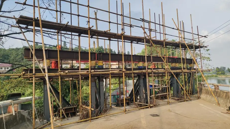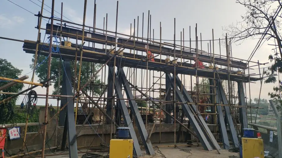 安全管控方面,項目部也做到了精準施策:采用“分段吊繩逐級放長”的方式確保河上橋兩側(cè)的光纖管、PE水管在頂升期間基本保持在原有的水平線上,實現(xiàn)斷裂零風險。河上橋頂升完成后,進一步采取雙重安全保障措施,利用48mm鋼絲繩將橋段端梁與鋼構(gòu)體系的橫梁捆綁,同時在原橋臺上設(shè)置型鋼立桿做好豎向支撐,確保后續(xù)橋下施作新橋墩橋臺的空間安全。